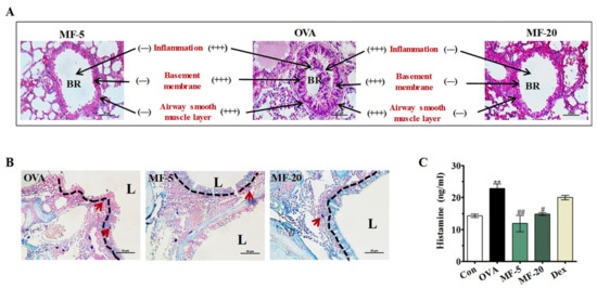 HE staining was used to investigate the effects of MF on lung histological changes. The results showed that OVA-induced AR mice showed significant inflammatory cell infiltration and airway epithelial thickening in the peribronchial and perivascular regions. However, treatment of MF or Dex markedly attenuated OVA-induced pathological changes (Figure 4A). In addition, the migration of mast cells from the epithelium in the MF group was inhibited compared to the OVA group (Figure 4B). Accumulated studies showed that histamine secreted from mast cells plays a major role in the pathogenesis of the allergic reaction to AR [14]. To ascertain the anti-allergic mechanism of MF on OVA-induced AR mice, the levels of histamine were measured in each group of mice. As shown in Figure 4C, we observed significantly increased levels of histamine in the OVA group compared to the Control group. However, such OVA-induced histamine release can be markedly suppressed by MF treatment.