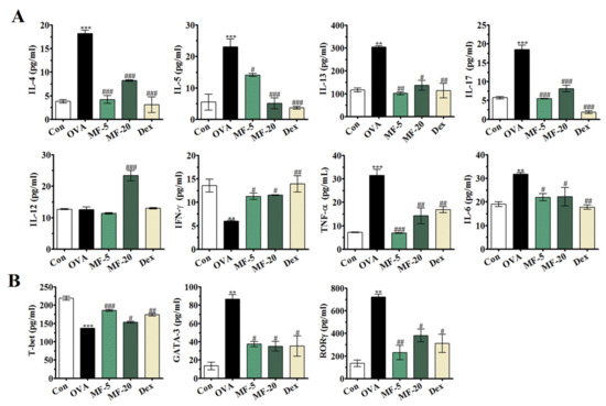 The expression of transcription factor T-bet, GATA-3, and RORγ were detected by ELISA. We discovered that the levels of transcription factors, GATA-3 and RORγ, varied drastically in the OVA group compared to the Control group, while T-bet was decreased. In contrast, MF treatment suppressed the production of GATA-3 and RORγ and upregulated T-bet (Figure 5B), providing further confidence in the data.