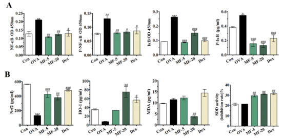 Recent studies showed that allergic inflammation is mediated by NF-κB activation [28]. To investigate the anti-inflammatory mechanism of MF, its action on the NF-κB signaling pathway was detected. The results of this study showed that OVA-induced NF-κB activation was significantly inhibited upon MF treatment. Thus, it can be suggested that MF exerts anti-inflammatory action by regulating NF-κB activation.