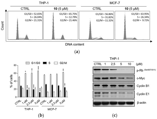 Compound 10 induces accumulation of THP-1 and MCF-7 cells in G1/G0 cell cycle phase. THP-1 or MCF-7 cells were treated with indicated concentrations of compound 10 for 24 h. (a) Representative histograms of DNA content in THP-1 and MCF-7 cells upon the treatment with compound 10. Cell cycle distribution was determined using flow cytometry. (b) Results of distribution of THP-1 and MCF-7 cell in cell cycle phases are expressed as the mean ± SD from three independent experiments. * p < 0.05, ** p < 0.01, *** p < 0.001, significantly different from drug-free control (CTRL). (c) The levels of cell cycle regulators were detected by immunoblot analysis using appropriate antibodies. Representative immunoblots of one out of three experiments are shown. CTRL, drug-free control.