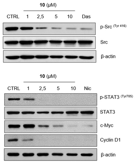 As mentioned, niclosamide has been recently identified as the small molecule inhibitor of STAT3 [34,35], the member of a signaling pathway that regulates many cellular processes important for tumorigenesis, including cell proliferation, cell cycle progression, apoptosis, or tumor angiogenesis [39]. As demonstrated in Figure 2, compound 10 markedly reduced phosphorylation of STAT3 at tyrosine 705 in a concentration-dependent manner. Our results also showed inhibited phosphorylation of STAT3 induced by niclosamide, added as the positive control. Furthermore, we examined the effect of 10 on the phosphorylation of Src tyrosine kinase, the upstream tyrosine kinase of STAT3, and its potent direct activator [40]. We found dose-dependently decreased Src phosphorylation caused by 10 in 24 h treatment. That effect was comparable to the inhibition induced by dasatinib, potent Src kinase inhibitor [41]. Finally, the exposure to 10 resulted in the decrease of protein levels of c-Myc and cyclin D1 in a concentration-dependent manner as well.