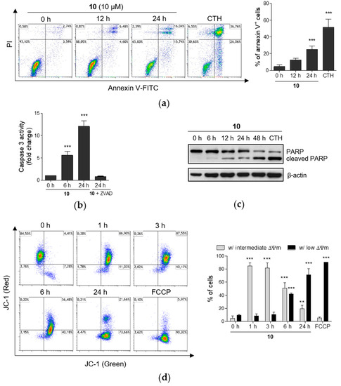 Compound 10 induces apoptosis in THP-1 cells. The same concentration of compound 10 (10 µM) was used for all experiments. (a) Cells were incubated with compound 10 for 12 h and 24 h, stained by annexin V-FITC conjugate and propidium iodide (PI) and analyzed by flow cytometry. Cells cultured with camptothecin (CTH, 5 µM) for 24 h were used as positive control. Representative flow cytometry plots are shown. (b) After the incubation of cells with compound 10, cell lysates were prepared and incubated with caspase 3 substrate Z-DEVD-R 110 and the fluorescence was measured. Cells pretreated with pan caspase inhibitor Z-VAD-FMK (ZVAD) for 30 min before the incubation with 10 were used as negative control. (c) The levels of PARP and cleaved PARP were detected by immunoblot analysis. Sample treated by 5 µM of camptothecin (CTH) for 24 h was used as positive control. (d) THP-1 cells were stained with JC-1 fluorescent probe and the changes of the mitochondrial membrane potential (ΔΨm) were analyzed by flow cytometry. Cells treated by FCCP for 30 min were considered as positive control sample. Cell subsets with high red and green fluorescence were identified as the cells with intermediate MMP, cell subsets with low red, but high green fluorescence were determined as the cells with low MMP as shown in representative flow cytometry plots. The results are shown as the mean ± SD from at least three independent experiments. ** p < 0.01, *** p < 0.001, significantly different from 0 h.
