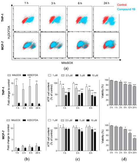 Compound 10 treatment results in loss of ATP cellular content and generation of mitochondrial superoxide in THP-1 cells. THP-1 and MCF-7 cells were treated with compound 10 (10 µM) if not stated otherwise for indicated time points. (a,b) THP-1 and MCF-7 cells were stained with MitoSOX Red or H2DCFDA and analyzed by flow cytometry. Dot plots from representative analysis are shown in panel A. (c) ATP cellular content was analyzed using luminescent assay. (d) Cell viability was determined by erythrosin B exclusion test at indicated time points. The results are shown as the mean ± SD from at least three independent experiments. * p < 0.05 ** p < 0.01, *** p < 0.001, significantly different from drug-free control (b,c) or 0 h (d).