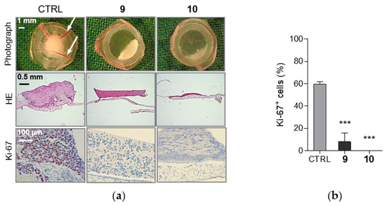 Compounds 9 and 10 inhibit proliferation of MCF-7 breast cancer xenografts. (a) MCF-7 breast cancer xenografts were topically treated with 9 or 10 (10 µM) for three days. 24 h later, xenografts were extracted (1st row), white arrows indicate tumor nourishing blood vessels. Paraffin-embedded MCF-7 xenografts were stained with hematoxylin and eosin (HE, 2nd row), original magnification 50×. The proliferation was analyzed by immunohistochemical staining of xenografts using proliferation marker, Ki-67 antigen (red nuclear stain, 3rd row). Representative microscopic pictures are shown, original magnification 200×. (b) The graph demonstrates the percentage of the Ki-67 positive, proliferating cells based on immunohistochemical staining of xenografts as described in (a). To calculate the proportion of marker positive and negative cells, 100–400 cells per tumor were evaluated. Data are mean ± SEM of n = 3 tumors/group. *** p < 0.001, significantly different from drug-free control (CTRL).