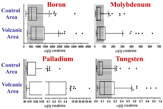 - Varrica, D.; Tamburo, E.; Dongarrà, G.; Sposito, F. Trace elements in scalp hair of children chronically exposed to volcanic activity (Mt. Etna, Italy). Sci. Total Environ. 2014, 470–471, 117–126. [Google Scholar] [CrossRef]