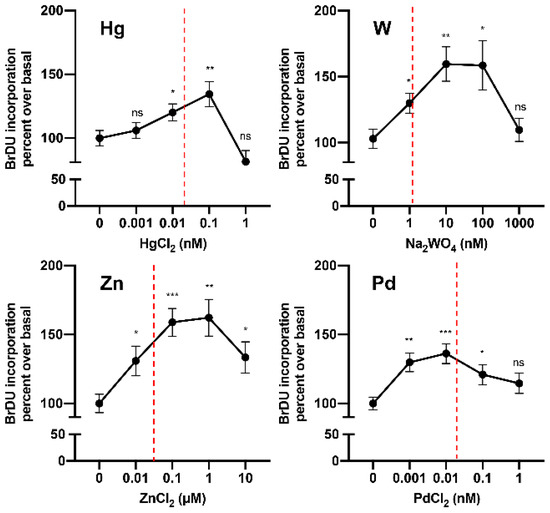 - Schmidt, C.M.; Cheng, C.N.; Marino, A.; Konsoula, R.; Barile, F.A. Hormesis effect of trace metals on cultured normal and immortal human mammary cells. Toxicol. Ind. Health 2004, 20, 57–68. [Google Scholar] [CrossRef] [PubMed]