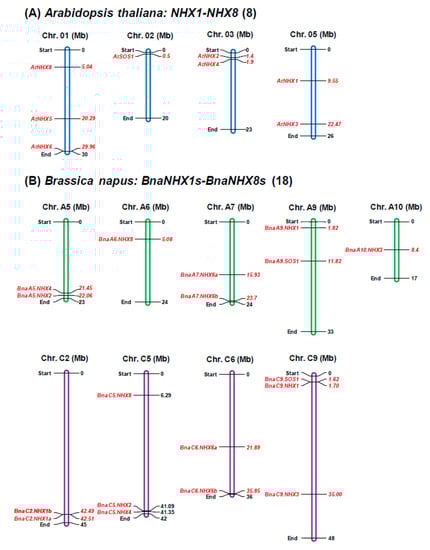 In this study, based on the nomenclature previously proposed [,,], we named NHXs in Brassica species following the criterion: genus (one capital letter) + plant species (two lowercase letters) + chromosome (followed by a period) + name of the NHX homologs in A. thaliana. For example, BnaA1.NHX1 represents an Arabidopsis NHX1 homolog on the chromosome A1 of B. napus.