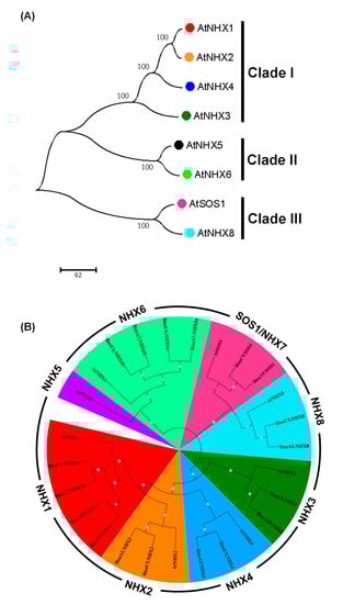 To elucidate the molecular evolution and phylogenetic relationships among the NHX proteins in Cruciferae species, we constructed unrooted phylogenetic trees involving AtNHXs and their homologs in Brassica species (Figure 3). In Arabidopsis, the NHX family members were mainly classified into three clades: Clade I (AtNHX1, AtNHX2, AtNHX3 and AtNHX4), Clade II (AtNHX5 and AtNHX6), and Clade III (AtSOS1/AtNHX7 and AtNHX8) (Figure 3A). Further, we performed a phylogeny analysis of 8 NHXs in A. thaliana and 18 NHXs in B. napus. The phylogenetic tree could also be three larger clades, which could be further classified into eight smaller categories, and each BnaNHX member was closely clustered with the corresponding homologs in A. thaliana (Figure 3B). The result indicated that the NHXs diverged before the Brassica speciation. Most of the NHXs within each subfamily had very short branch lengths (Figure 3B), which suggested the occurrence of recent genetic divergence.