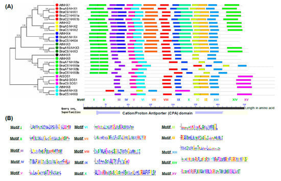 Identification and characterization of the conserved motifs in the Na+/H+ antiporters (NHXs) in Arabidopsis thaliana and Brassica napus. Molecular identification (A) and sequence characterization (B) of the conserved motifs in the NHXs. In Figure 4A, the boxes with different colors indicate different conserved motifs (motif I–XV), and grey lines represent the NHX regions without detected motifs. In Figure 4B, the larger the fonts, the more conserved the motifs.
