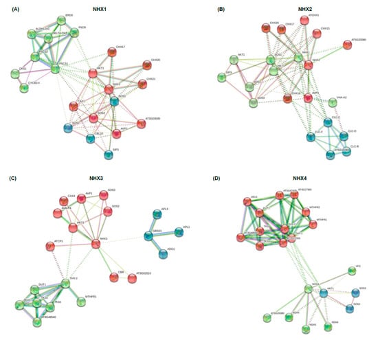 To further identify which proteins might interact with BnaNHXs, we constructed protein interaction networks using the STRING database, based on either known experimental or predicted interactions. A previous study has shown that the transport activity of NHX is regulated by SOS2 and SOS3 [], and HKT1 can also transport Na+ []. Consistently, all the NHXs interacted with high-affinity K+ transporters (HKTs), calcineurin B-like protein 4 (CBL4/SOS3), and CBL-interacting protein kinase 24 (CIPK24/SOS2) (Figure 5). In addition, except NHX4 and NHX6, the other NHXs interacted with AVP1 (Figure 5), which serves a job-sharing role with V-ATPase in vacuolar acidification [].
