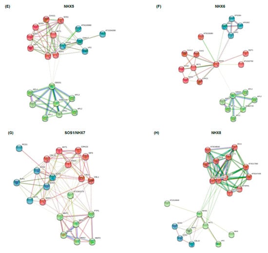 Protein–protein interaction networks involving the Na+/H+ antiporters (NHXs). The interaction networks of NHX1 (A), NHX2 (B), NHX3 (C), NHX4 (D), NHX5 (E), NHX6 (F), SOS1/NHX7 (G) and NHX8 (H) with other proteins were constructed by the STRING web-server. Network nodes represent proteins. Network is clustered to three clusters, which are represented with red, green and blue nodes, respectively. Colored nodes: query proteins and first shell of protein interactors; white nodes: second shell of protein interactors. Empty nodes: proteins of unknown 3D structure; filled nodes: some 3D structure is known or predicted. Edges represent protein–protein associations.