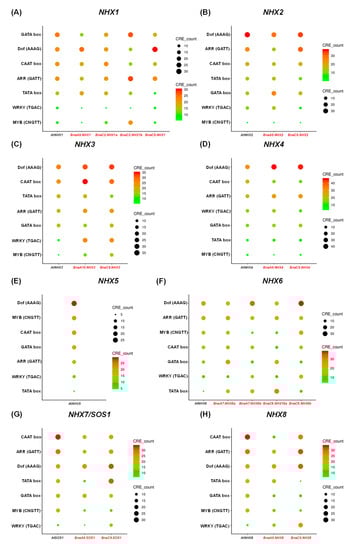 Enrichment analysis of the cis-acting regulatory elements (CREs) in the gene promoter regions of Na+/H+ antiporters (NHXs) in Brassica napus. Enrichment analysis of the CREs in the promoter regions of NHX1s (A), NHX2s (B), NHX3s (C), NHX4s (D), AtNHX5 (E), NHX6s (F), NHX7s/SOS1s (G), and NHX8s (H). In the scatter plot, the larger the circle size, the more the corresponding CREs.