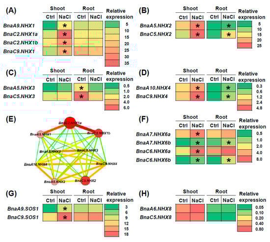 The qRT-PCR assisted transcriptional characterization of the Na+/H+ antiporters (NHXs) in Brassica napus under salt stress. (A–D) Differential expression profiling of: BnaNHX1s (A), BnaNHX2s (B), BnaNHX3s (C), and BnaNHX4s (D) between the control (Ctrl) and salt stress. (E) The gene co-expression network diagram involving BnaNHX1s, BnaNHX2s, BnaNHX3s, and BnaNHX4s. (F–H) Differential expression profiling of BnaNHX6s (F), BnaSOS1s/BnaNHX7s (G), and BnaNHX8s (H) under salt stress. For the transcriptional analysis, the 7 d-old uniform B. napus seedlings after seed germination were hydroponically cultivated in a NaCl-free solution for 10 d, and then were transferred to 200 mM NaCl for 12 h until sampling. The shoots and roots were individually sampled, and each sample includes three independent biological replicates. The significance level of p < 0.05 is used as the threshold to identify the differential BnaNHX expression under salt stress. The differentially expressed genes with higher expression are indicated with asterisks.