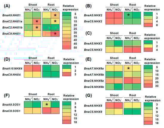 The qRT-PCR-assisted transcriptional characterization of the Na+/H+ antiporters (NHXs) in Brassica napus under different forms of nitrogen (N) conditions. Differential expression of BnaNHX1s (A), BnaNHX2s (B), BnaNHX3s (C), BnaNHX4s (D), BnaNHX6s (E), BnaNHX7s (F), and BnaNHX8s (G) under nitrate (NO3-) and ammonium (NH4+) conditions. For the transcriptional analysis, the rapeseed seedlings were first hydroponically cultivated under 6.0 mM nitrate (NO3-) for 10 d, and then were transferred to an N-free solution for 3 d. Subsequently, the above seedlings were sampled after treatment with 6.0 mM ammonium (NH4+) for 3 d. The shoots and roots were individually sampled, and each sample includes three independent biological replicates. The significance level of p < 0.05 is used as the threshold to identify the differential BnaNHX expression under NO3- and NH4+ conditions. The differentially expressed genes with higher expression between different treatments are indicated with asterisks.