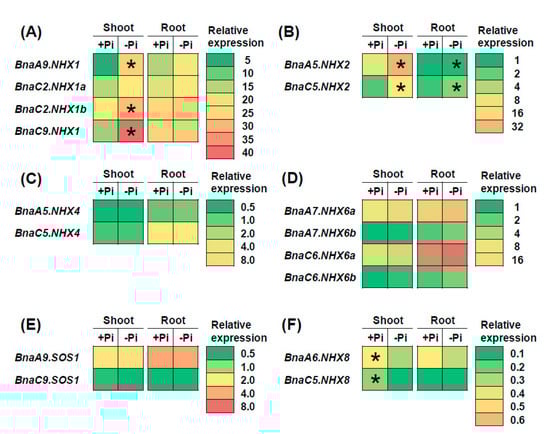 The qRT-PCR-assisted transcriptional characterization of the Na+/H+ antiporters (NHXs) in Brassica napus under different phosphate (Pi) levels. Differential expression of BnaNHX1s (A), BnaNHX2s (B), BnaNHX4s (C), BnaNHX6s (D), BnaNHX7s (E), and BnaNHX8s (F) under high Pi and low Pi levels. For the transcriptional analysis, the 7 d-old uniform B. napus seedlings after seed germination were first hydroponically grown under 250 μM KH2PO4 (+Pi) for 10 d, and then were transferred to 5 μM KH2PO4 (-Pi) for 3 d until sampling. The shoots and roots were individually sampled, and each sample includes three independent biological replicates. The significance level of P < 0.05 is used as the threshold to identify the differential expression of BnaNHXs under high Pi and low Pi conditions. The differentially expressed genes with higher expression are indicated with asterisks.