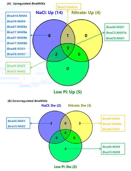 Based on the transcriptional results above, we constructed Venn diagrams to summarize the transcriptional responses of BnaNHXs to salt stress, nitrate supply, and low phosphate (Figure 10). The result showed that three BnaNHX1s (BnaA9.NHX1, BnaC2.NHX1b, and BnaC9.NHX1) were consistently upregulated under the above three nutrient conditions (Figure 10A). A BnaNHX gene (BnaC2.NHX1a) was upregulated under both salt stress and nitrate supply conditions, and two BnaNHX2s (BnaA5.NHX2 and BnaC5.NHX2) were upregulated under both salt stress and low phosphate conditions (Figure 10A). By contrast, none of the BnaNHXs were consistently downregulated under salt stress, nitrate supply, and low phosphate conditions (Figure 10B).