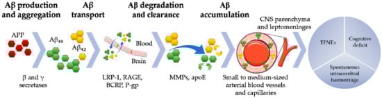 Amyloid precursor protein (APP) is cleaved in the amyloidogenic pathway by β and γ secretases to form amyloid beta (Aβ) Aβ40 and Aβ42 peptides. Aβ40 is the main peptide associated with cerebral amyloid angiopathy. These peptides are transported across the blood brain barrier (BBB) through membrane receptors and transporters (i.e., low density lipoprotein receptor-related protein 1, LRP-1; receptor advanced glycation end products, RAGE; breast cancer resistance protein, BCRP; permeability glycoprotein, P-gp) and degraded by specific enzymes, such as matrix metallopeptidases (MMPs) and apolipoprotein E (apoE). The accumulation of amyloid fibrils in the walls of the small- and medium-calibre leptomeningeal and cortical arteries may result from increased production and impaired transport and degradation of Aβ peptides. This aberrant pathway causes spontaneous intracerebral haemorrhage, cognitive decline and transient focal neurological events (TFNEs; CNS, central nervous system).