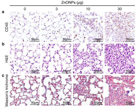Repeated exposure of mice to zinc oxide nanoparticles (ZnONPs) induces inflammatory cell infiltration and fibrosis in the lungs. Mice were subjected to repeated exposure to different doses of ZnONPs twice a week for 4 weeks. Lung sections were stained with (a) leukocyte marker CD45 (brown) for inflammatory cell infiltration, (b) H&E staining for morphology, and (c) Masson’s trichrome (blue) for collagen.