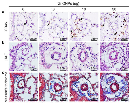 Repeated exposure of mice to ZnONPs enhances perivascular leukocyte infiltration, wall thickening and collagen deposition of the arterioles in the lungs. Mice were subjected to repeated exposure to different doses of ZnONPs twice a week for 4 weeks. Lung sections with arterioles were stained with (a) leukocyte marker CD45 (brown) for inflammatory cell infiltration (arrows), (b) H&E for morphology, and (c) Masson’s trichrome (blue) for collagen.