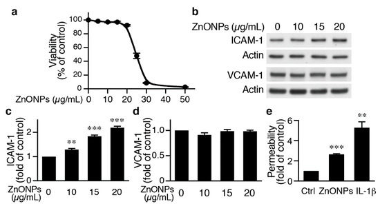 To begin to investigate the underlying mechanisms of ZnONPs-mediated leukocyte infiltration, we determined the effects of ZnONPs on endothelial cell function. We first treated human umbilical vein endothelial cells (HUVECs) with different concentrations of ZnONPs, and determined cell viability after 24 h. Treatment of HUVECs with ZnONPs up to 20 µg/mL caused no or minimal effect on viability (Figure 3a). However, a small increase to 25 µg/mL significantly decreased cell viability to 41.3 % (p < 0.01 vs. control) and higher concentrations (30 or 50 μg/mL) severely reduced viability to 7.5% and 2.4%, respectively (Figure 3a). As ZnONPs have been shown to elicit endothelial inflammatory responses, we examined expressions of adhesion molecules intercellular adhesion molecule-1 (ICAM-1) and vascular cell adhesion molecule-1 (VCAM-1), two inflammatory indicators of endothelial cells [19]. ZnONPs at 10, 15 or 20 μg/mL significantly increased ICAM-1 expression (Figure 3b,c). Intriguingly, ZnONPs did not affect VCAM-1 expression, even up to 20 μg/mL (Figure 3b,d).