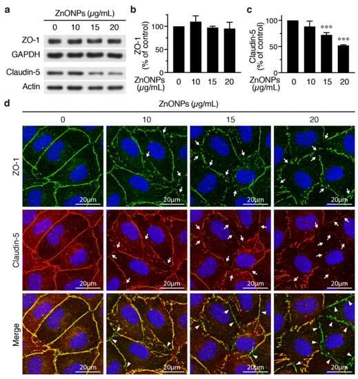 In contrast to ZO-1, ZnONPs at 15 and 20 µg/mL significantly reduced endothelial-specific tight junction protein claudin-5 expression to 72.3% and 52.2%, respectively (Figure 4a,c). Immunostaining showed a continuous distribution of claudin-5 along cell-cell junctions in control cells (Figure 4d, middle row, left panel). Although 10 µg/mL ZnONPs only slightly reduced claudin-5 level by Western blotting (Figure 4a,c), we observed a discontinuous distribution of claudin-5 at the junctions (Figure 4d, middle row, arrows). Higher concentrations of ZnONPs further decreased junctional distribution of claudin-5 (Figure 4d, middle row, arrows). Merged images revealed an overlapping expression of ZO-1 and claudin 5 at cell junctions (yellow color) in the control cells (Figure 4d, bottom row, left panel). The number of green segments (ZO-1) at the junctions positively correlated with concentrations of ZnONPs (Figure 4d, bottom row, arrowheads), indicating presence of ZO-1 but not claudin-5, which might be due to reduced claudin-5 expression. These results suggest that ZnONPs alter junctional distribution of ZO-1 and decrease expression level of claudin-5, leading to disruption of endothelial tight junctions.