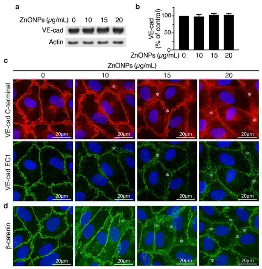 Effects of ZnONPs on adherens junctions in HUVECs. (a) HUVECs were treated with different concentrations of ZnONPs (0, 10, 15 and 20 µg/mL) for 24 h, and total proteins prepared for Western blot analysis to detect vascular endothelial (VE)-cadherin. Actin was used as loading control. A representative immunoblot is shown. (b) Quantification of VE-cadherin (n = 3, each). Data are mean ± SE, Student’s t-test shows no significant difference. (c) Representative images of double immunofluorescence staining of HUVECs with antibodies against VE-cadherin c-terminal (red) and EC1 domain (green). Cell nuclei were stained with DAPI (blue). (d) Distribution of β-catenin (green) after treatment with ZnONPs. *, diffused and disorganized expression of VE-cadherin or β-catenin at the cell-cell junctions.