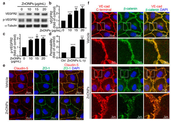 Activation of the vascular endothelial growth factor (VEGF)-VEGF receptor 2 (VEGFR2) axis has been shown to facilitate VE-cadherin internalization [20,21]. We thus investigated the role of VEGFR2 in the effect of ZnONPs on endothelial junctions. ZnONPs increased not only total VEGFR2 but also VEGFR2 phosphorylation/activation (Figure 6a–c). Since the HUVEC growth medium contains VEGF, to rule out the possibility that this is due to VEGF in the medium, HUVECs were starved/quiesced in medium without VEGF before ZnONPs treatment. Under starvation conditions, ZnONPs maintained its ability to increase endothelial permeability (Figure 6d), suggesting that ZnONPs-mediated endothelial paracellular barrier alterations were likely independent of VEGF. Supporting this notion, ZnONPs not only elicited discontinuity of the tight junction proteins claudin-5 and ZO-1 (Figure 6e), but also caused diffused VE-cadherin staining at the cell-cell junctions (Figure 6f, left column).