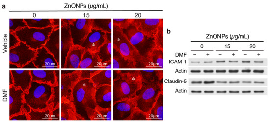 Aryl hydrocarbon receptor (AhR) inhibitor 3′,4′-dimethoxyflavone (DMF) abolishes ZnONPs-induced ICAM-1 but not claudin-5 expressions or alters VE-cadherin junctional distribution. HUVECs were pretreated with 10 µM DMF, before treatment with ZnONPs for 24 h. (a) Representative images of immunofluorescence staining with antibody against VE-cadherin c-terminal domain (red) are shown. Cell nuclei were stained with DAPI (blue). *, diffused cytosolic distribution of VE-cadherin. (b) Western blotting was performed to detect ICAM-1 and claudin-5 expressions. Actin was used as a loading control. A representative of at least four experiments is shown.