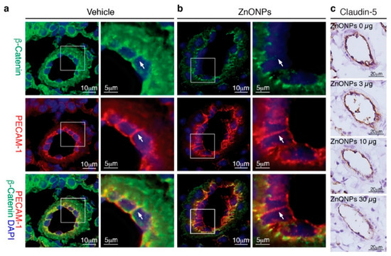 All experimental procedures were performed in accordance with the NIH guidelines (Guide for the care and use of laboratory animals) and approved by the Institutional Animal Care and Use Committee of National Health Research Institutes, Taiwan (#NHRI-IACUC-104016-A, approved on 10 March 2015). Wild-type mice (C57BL/6JNarl) were purchased from the National Laboratory Animal Center, Taiwan and acclimated for 2 weeks at the National Health Research Institutes (Taiwan) animal facility under a 12 h light/dark cycle at 23 ± 1 °C, with a relative humidity of 39–43%. Water and food were provided ad libitum. Mice were subjected to oropharyngeal aspiration of ZnONPs (0, 3, 10 and 30 µg/mouse), twice a week for 4 weeks, and the lungs harvested as we described previously [6]. Animals were killed through isoflurane inhalation, lungs were lavaged with saline, and then carefully dissected and fixed in 10% neutral buffered formalin for 48 h, before processing (including dehydration and clearing) and embedding in paraffin. Serial 5-µm sections were collected. Lung sections were stained with H&E for general histopathological examinations. Masson’s trichrome staining (Sigma, St. Louis, MO, USA) was utilized to evaluate collagen deposition. For immunohistochemistry, sections were treated with heated citrate buffer (ScyTek Laboratories, Logan, UT, USA) for 20 min, before blocking with 10% goat serum. Subsequently, sections were incubated overnight at 4 °C with primary antibodies against CD31 (Cell Signaling Technology, Danvers, MA, USA, rabbit, #77699), claudin-5 (Thermo Scientific, Waltham, USA, mouse, 35-2500), β-catenin (BD Bioscience, mouse, 610154), or CD45 (BD Biosciences, San Jose, CA, USA, rat, 550539). Sections were then incubated with secondary Alexa Flour (Thermo Scientific) or polymer-peroxidase conjugated (DakoCytomation, Glostrup, Denmark) antibodies. For the latter, diaminobenzidine (DakoCytomation) was subsequently used for the visualization of target proteins, followed by hematoxylin for counterstaining (Muto Pure Chemicals, Tokyo, Japan).