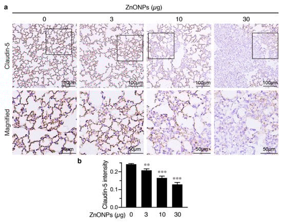 We next evaluated the effects of ZnONPs on tight junction protein claudin-5 in the mouse lungs. Claudin-5 was highly expressed in the endothelial cell-cell junctions in the control pulmonary arterioles (Figure 8c, 0 µg) and exposure to ZnONPs reduced claudin-5 level in a dose-dependent manner (Figure 8c). As in arterioles, claudin-5 was highly expressed in the alveolar endothelial cell-cell junctions in the control lungs (Figure 9a, left column). Exposure to ZnONPs dose-dependently reduced claudin-5 expressions in alveolar septa (Figure 9a,b). At a low dose of 3 μg, ZnONPs elicited visible fragmented junctional distribution and a reduced level (by 14.3% vs. control) of claudin-5 (Figure 9a,b). Compared with control, ZnONPs at 10 and 30 µg severely reduced presence of claudin-5 by 31.9% and 46.9%, respectively (Figure 9a,b). Collectively, these results indicate that exposure to ZnONPs compromises the vascular integrity of the pulmonary arterioles and alveoli in mice.