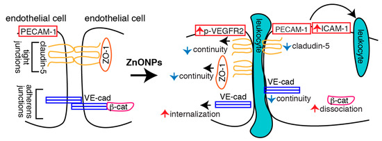 Schematic illustration of the actions of ZnONPs on endothelial cells. ZnONPs increase ICAM-1 expression, together with PECAM-1 might facilitate leukocyte adhesion and transmigration into the vessel wall. ZnONPs not only decrease claudin-5 expression but also cause discontinuity of claudin-5 and ZO-1 at the junctions; these collectively disrupt endothelial cell-cell tight junctions. ZnONPs activate VEGFR2 and elicit VE-cadherin internalization, accompanied with discontinuous distribution of VE-cadherin at the junctions and dissociation of β-catenin from VE-cadherin, resulting in disassembly and destabilization of adherens junctions. Disruptions of both tight and adherens junctions lead to increased endothelial barrier dysfunction and permeability, which might facilitate leukocyte diapedesis via paracellular junctional opening.