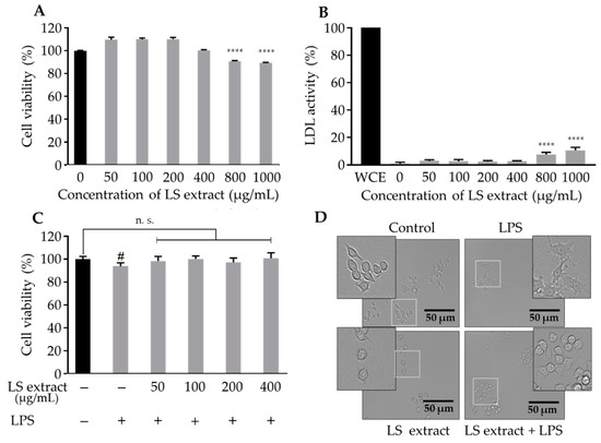 2.2. Effect of LS Leaf Extract on RAW 264.7 Cells Viability