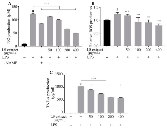 2.3. LS Leaf Extract Inhibits the Production of NO, ROS, and TNF-α in LPS-Stimulated RAW 264.7 Cells