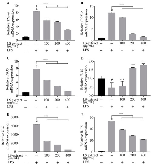 2.4. LS Leaf Extract Inhibits the Expression of Inflammatory Genes in LPS-Stimulated RAW 264.7 Cells