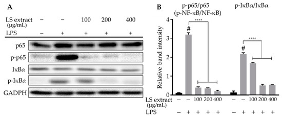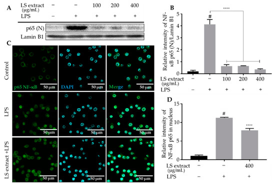 2.5. LS Leaf Extract Inhibits Phosphorylation and Translocation of NF-ĸB in LPS-Stimulated RAW 264.7 Cells