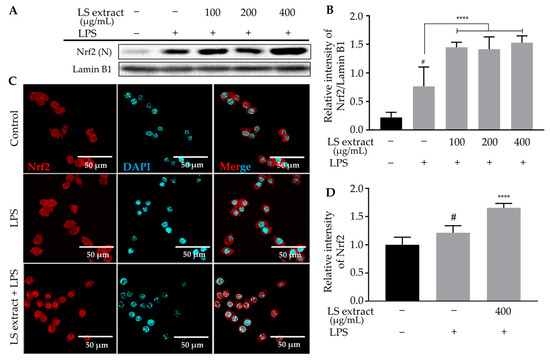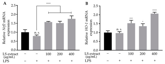 2.7. LS Leaf Extract Promotes the Activation of Nrf2/HO-1 Pathway in LPS-Stimulated RAW 264.7 Cells