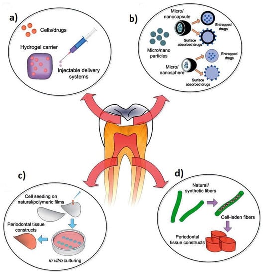 Schematic diagram of different biomaterials as (a) injectable hydrogels, (b) micro-nanoparticles, (c) natural polymers seeded with periodontal ligament (PDL) cells and (d) natural/synthetic scaffolds for periodontal disease treatment. Reprinted from [70] with permission from Taylor & Francis Online.