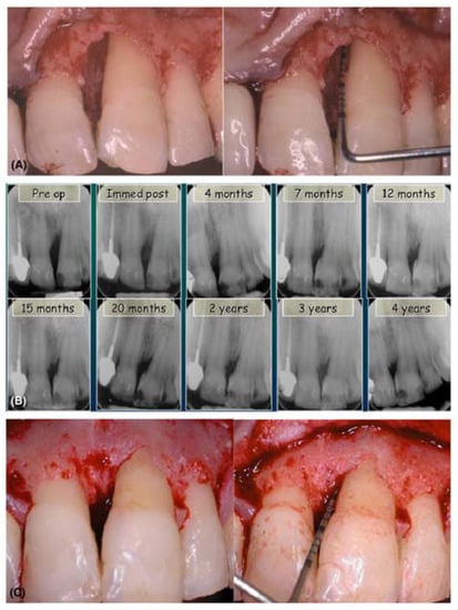 - Pontoriero, R.; Wennström, J.; Lindhe, J. The use of barrier membranes and enamel matrix proteins in the treatment of angular bone defects. A prospective controlled clinical study. J. Clin. Periodontol. 1999, 26, 833–840. [Google Scholar] [CrossRef]
