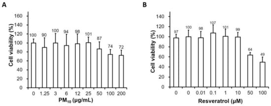 Effects of particulate matter and resveratrol on human keratinocyte viability. Viability of keratinocytes treated with (A) PM10 (0, 1.25 μg/mL, 3 μg/mL, 6 μg/mL, 12 μg/mL, 25 μg/mL, 50 μg/mL, 100 μg/mL, or 200 μg/cm2) or (B) resveratrol (0, 0.01 μg/mL, 0.1 μg/mL, 1 μg/mL, 10 μg/mL, 50 μg/mL, or 100 μM) for 24h measured using the water-soluble tetrazolium salt assay. Data are presented as the mean ± standard deviation of three independent experiments (n = 3). The ratio of surviving cells is relative to the untreated control. PM, particulate matter.