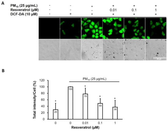 Keratinocytes (120,000 cells per chamber) were first seeded onto chamber slides (#154852, Thermo Fisher Scientific, Waltham, MA, USA). After incubation overnight and following 2 h of serum starvation, resveratrol was added, and then 6 h later, PM10 was added. After another overnight incubation, the cells were incubated with DCF-DA (10 µM) at 37 °C for 30 min. The slides were washed with keratinocyte basal media three times and mounted. Digital images were acquired using a confocal laser scanning microscope (LSM710, Zeiss, Oberkochen, Germany) and analyzed using ImageJ (NIH, Bethesda, MD, USA).