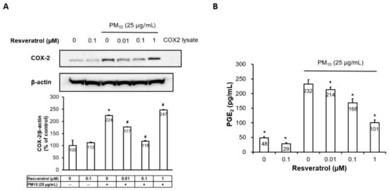 We showed that resveratrol inhibits PM-induced ROS formation in keratinocytes and also suppresses the subsequent cellular inflammatory response via inhibition of MAPK activation. Consequentially, resveratrol reduced the PM-induced COX2/PGE2 expression and proinflammatory cytokine expression associated with skin barrier dysfunction and aging. Therefore, we suggest that resveratrol may have a potential role in the prevention of air pollution-related skin problems.