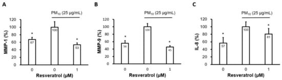 MMP-1 and MMP-9 are known to play a critical role in skin aging via collagen degradation [,,]. They have also been reported to be the proinflammatory cytokines induced by PM in human keratinocytes [,,]. Resveratrol at a concentration of 1 μM significantly reduced the PM-induced increase in MMP-1 and MMP-9 levels (Figure 4A,B). In addition, resveratrol reduced IL-8 levels induced by PM (Figure 4C).