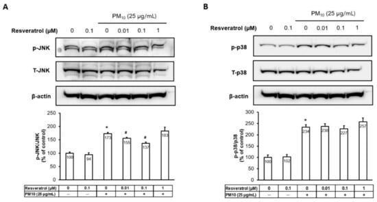The Western blot analysis showed that PM activated p38 and c-Jun N-terminal kinase (JNK) (Figure 5). Whereas the activation of JNK was attenuated by resveratrol pretreatment in a dose-dependent manner until the 0.1 μM concentration (Figure 5A), the activation of p38 was not affected by resveratrol.