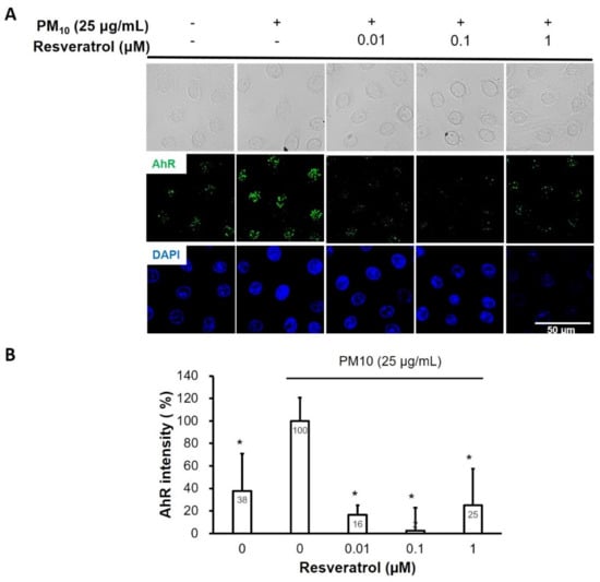 Intranuclear expression of AhR was increased after keratinocytes were exposed to PM, and pretreatment with resveratrol reduced this expression in a dose-dependent manner until the 0.1 μM concentration (Figure 6).
