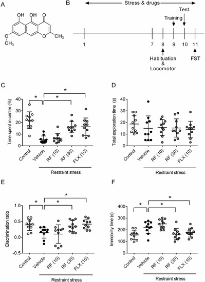 Effect of rubrofusarin on depressive symptoms: Restraint stress (4 h per day) was treated for 11 days. Rubrofusarin (10 or 30 mg/kg) or fluoxetine (10 mg/kg) was administered to mice 1 h before the restraint stress treatment. (A) Structure of rubrofusarin. (B) Schematic diagram of experimental schedule. (C) Time spent in the center of an open field in the habituation trial of object recognition test. (D) Total exploration time for objects in training trial of object recognition test. (E) Discrimination ration in the test trial of an object recognition test. (F) Immobility time in forced swimming test. Data represented as mean ± SD with raw data. * p < 0.05.