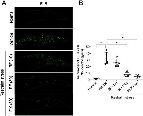 Previous reports indicated that CRS causes neurodegeneration in the hippocampus [24]. To test whether RF rescues CRS-induced neuronal cell death, we conducted Fluoro Jade-B (FJB) staining (Figure 2A). Mice were sacrificed 1 h after the forced swimming test (FST) test for FJB staining. The CRS-treated group showed significantly more FJB-positive cells in the hippocampal dentate gyrus (DG) region (p < 0.05). RF (30 mg/kg) or FLX (10 mg/kg) treatment blocked the increase of FJB-positive cells by CRS (F4,20 = 41.01, p < 0.05, n = 5/group, Figure 2B). The FJB results suggest that RF blocked CRS-induced neuronal cell death in the hippocampus.
