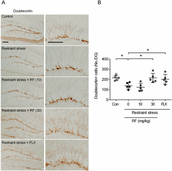 Various animal models and patients with major depressive disorders show reductions in adult neurogenesis within the hippocampus [25]. To test whether rubrofusarin ameliorates reductions in neurogenesis using the CRS model, we measured doublecortin-positive cells in the hippocampus. Mice were sacrificed 1 h after the FST test for doublecortin immunostaining. The CRS-treated group showed significant reductions in the number of doublecortin-positive cells in the DG region of the hippocampus (p < 0.05, Figure 3A,B). RF treatment ameliorated this reduction in a dose-dependent manner (F4,20 = 9.615, p < 0.05, n = 5/group, Figure 3B). FLX also ameliorated the reduction in the number of doublecortin-positive cells in CRS-treated mice (p < 0.05, Figure 3A,B).
