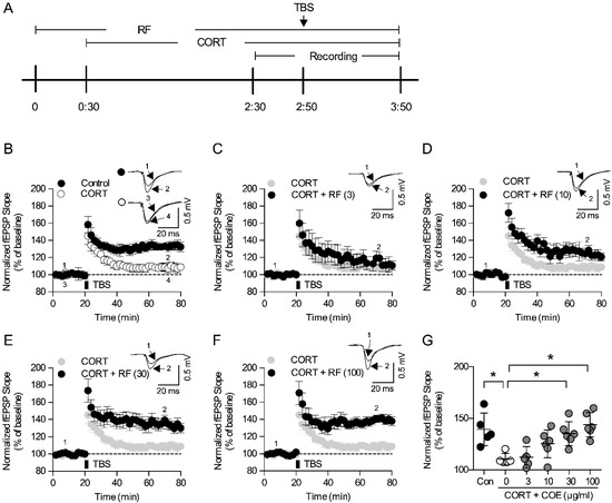 Effect of rubrofusarin on corticosterone-induced synaptic deficit: (A) Schematic diagram of experimental schedule. Hippocampal slices were treated with rubrofusarin (RF) from 30 min before corticosterone (CORT) treatment. HFS was delivered to the slices 30 min after the CORT treatment. (B) Normalized fEPSP slop of control and CORT (1 µM) group for 80 min. (C) Normalized fEPSP slop of CORT + RF (3 µM) group for 80 min. (D) Normalized fEPSP slop of CORT + RF (10 µM) group for 80 min. (E) Normalized fEPSP slop of CORT + RF (30 µM) group for 80 min. (F) Normalized fEPSP slop of CORT + RF (100 µM) group for 80 min. Data represented as mean ± SD. (G) Normalized fEPSP slop of each group during last 10 min. Data represented as mean ± SD with raw data. * p < 0.05.