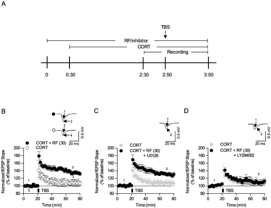 The role of Akt/GSK-3β signaling in the effect of rubrofusarin synaptic deficit: (A) Hippocampal slices were co-treated with rubrofusarin (RF) and inhibitors. Corticosterone (1 µM, CORT) was introduced to the slices 30 min after RF treatment. Theta burst stimulation (TBS, 5 trains of 4 pulses at 100 Hz) was delivered to the slices 30 min after the CORT treatment. (B) Normalized fEPSP slop of CORT + RF (30 µM) and CORT group for 80 min. (C) Normalized fEPSP slop of CORT + RF (30 µM) + U0126 (50 µM) group for 80 min. (D) Normalized fEPSP slop of CORT + RF (30 µM) + LY294002 (50 µM) group for 80 min. Data represented as mean ± SD.