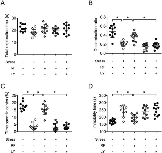 Effect of LY294002 on the effect of rubrofusarin on depressive symptoms: Mice were treated with LY204002 (1 nmol, 3 µL, intracerebroventricular injection (i.c.v.)) 30 min before rubrofusarin treatment. Rubrofusarin was administered to mice 1 h before restraint stress protocol. (A) Total exploration time for objects in training trial of object recognition test. (B) Discrimination ration in test trial of object recognition test. (C) Time spent in center of open field in the habituation trial of object recognition test. (D) Immobility time in forced swimming test. Data represented as mean ± SD with raw data. * p < 0.05.